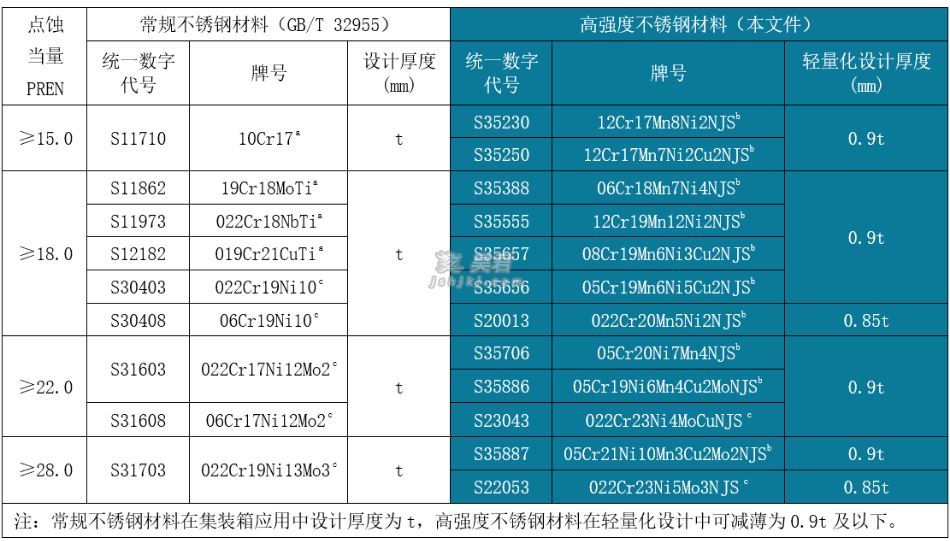 表2:干散货集装箱用高强度不锈钢轻量化推荐设计表(摘录于YB/T 6352-2025附录D)