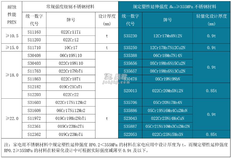 表3:家电用不锈钢材料中规定塑性延伸强度RP0.2≥355MPa推荐轻量化设计厚度表(摘录于YB/T 6353-2025附录D)
