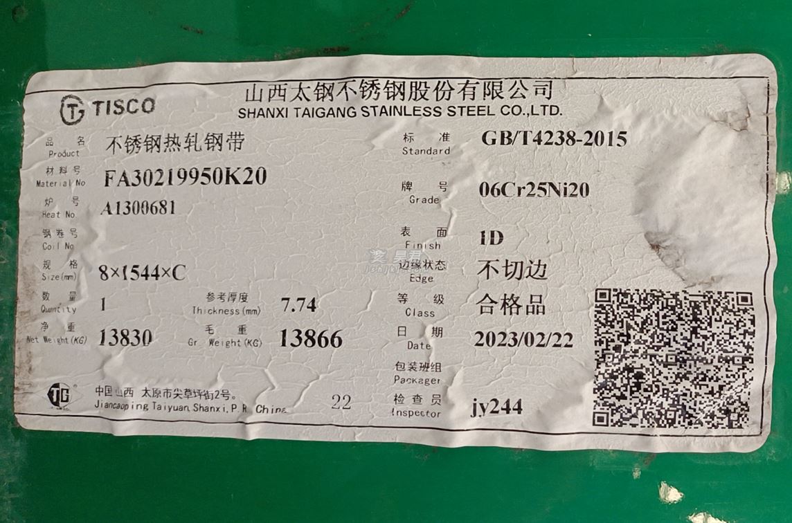 规格:每个钢厂在规格信息这一项是各不相同的。一般来说,太钢标签规格是用诸如8*1544*C,表示的。其中,“8”是不锈钢热轧钢带的“标签厚度”,它区别于参考厚度;“1554”是实际宽度;“C”表示长度。