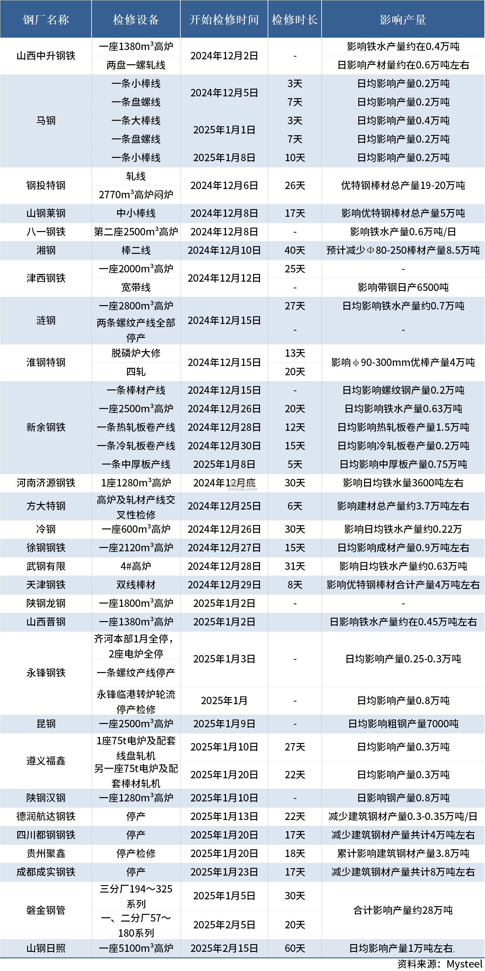 据Mysteel不完全统计,近期国内钢厂陆续发布检修信息,其中,2025年1月3日山东莱钢永锋钢铁开始检修,齐河本部1月全停,2座电炉全停,之前在产的一条螺纹产线停产,目前计划停产到月底,日均影响产量0.25-0.3万吨。永锋临港计划1月份减产,转炉轮流停产检修,日均影响产量0.8万吨,计划检修至1月底。具体情况如下: