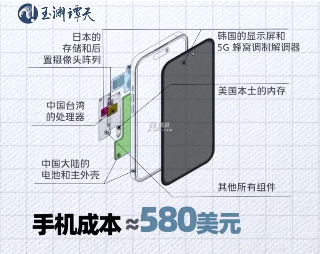 以一部256GB版本的iPhone 16 Pro为例,官方售价为1100美元。根据美国媒体计算的数据,苹果公司制作一部手机,所有硬件成本加起来约549.73美元。其中有来自中国、韩国和日本等多个国家的零部件,如果再加上组装和测试,手机成本大约580美元。